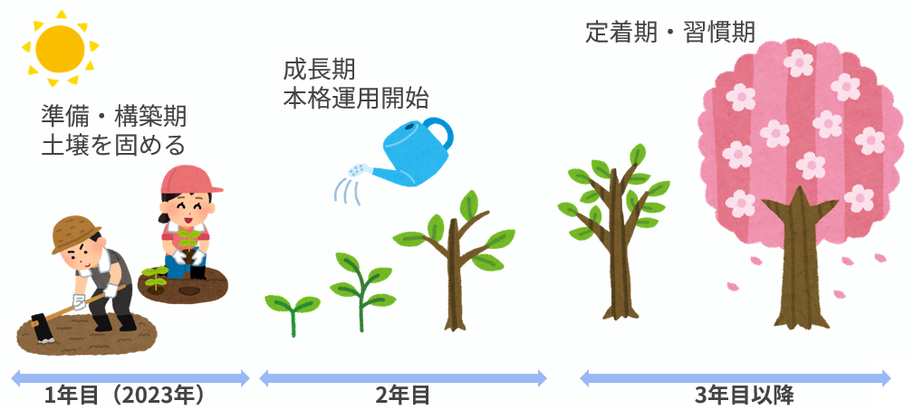 準備・構築期として土台を固める1年目、本格的に運用を開始する成長期の2年目、定着期・習慣期の3年目、そして4年目以降もブラッシュアップとサポートを続けます。