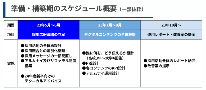 ちなみに、上記プロジェクトの成果をより一層高めるために、オウンドメディア運用(SNS・採用ホームページ等)のコンサルティングも行っていますが、本記事では最も力を注いでいる「新卒採用制度の構築」に焦点を当てています。