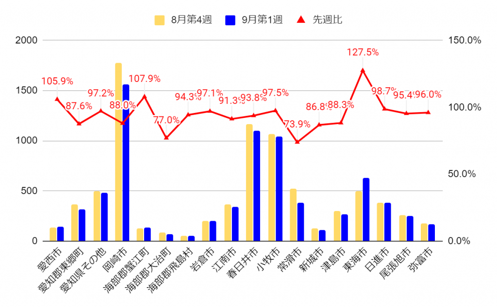 その他のエリアでも、1100件ほど件数の減少がありました(先週比)。多くの市町村で減少となっていますが、半田市、東海市、美浜町では10%以上の伸び率となっています。