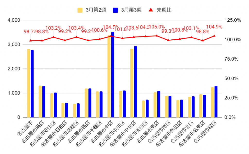 まずは名古屋市内から見ていきます。先週比で418件のプラスです。先週に引き続き、中村区や中区では件数を伸ばしています。