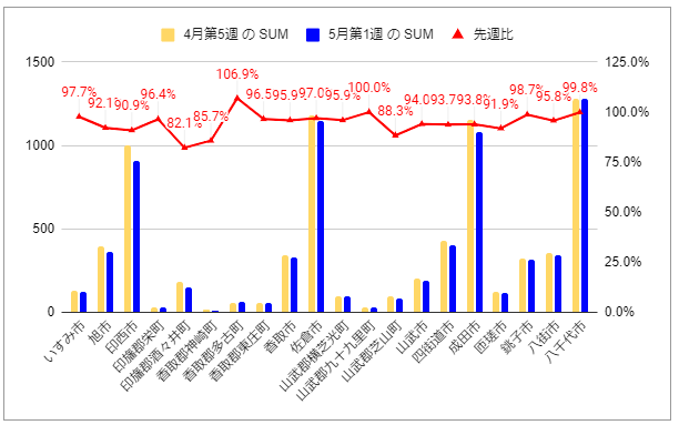 その他のエリアでは、先週よりも大幅に減少しているエリアが多く、全体では1406件の減少となりました。
