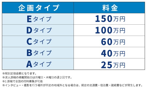 | 企画タイプ | 掲載料金(4週間) | 検索順位 | 特徴 |