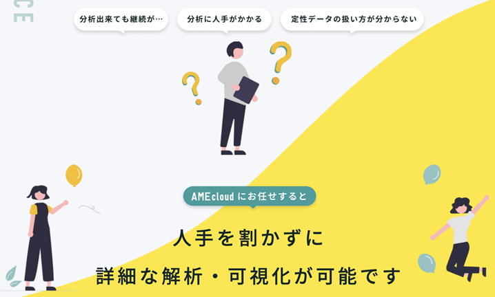 『AME Cloud』はIT企業のAME Companyが提供する口コミ・アンケート分析ツール。特に自由記述欄の分析など定性データの分析に強く、人気を得ています。