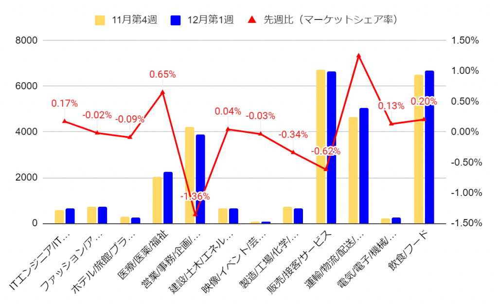 続いては業種別の掲載件数となります。件数では、電気・電子・機械・自動車関連職が最も増加。マーケットシェアでは、 運輸・物流・配送関連職が最も伸びています。