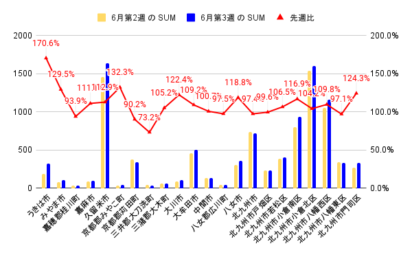 その他のエリアでは、全体で約2000件の増加で、増加したエリアが多い週となりました。エリア全体の母数が少ないエリアもありますが、150%以上や300%以上など、先週比が大幅に伸びたエリアが目立ちました。