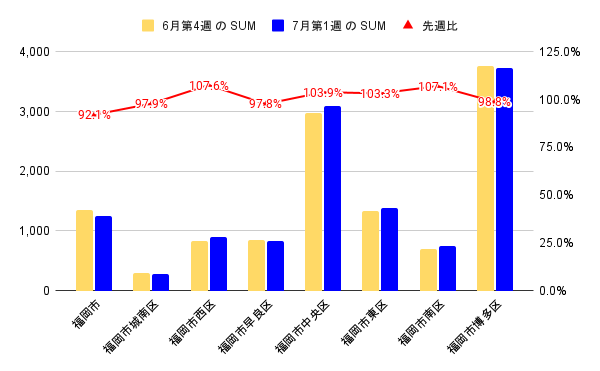 まずは福岡市内です。福岡市では先週比92.1%、107件の減少。増加率が高かったのは福岡市西区で、先週比107.6%、64件の増加となりました。