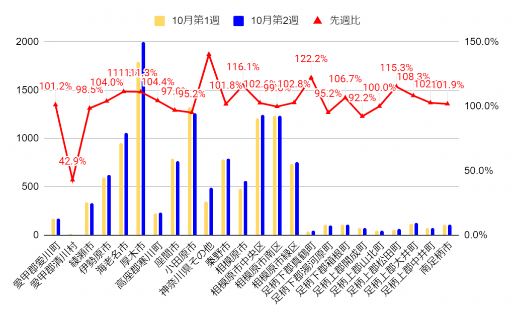 その他のエリアです。こちらも先週から2052件のプラスとなり、県内全域で増加へと転じています。こちらはエリアごとに変動が大きく、海老名市や厚木市、川崎市などでは10%以上の増加。採用ニーズが高まっています。