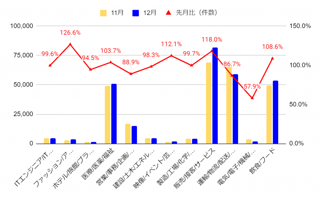 12月の求人件数は、11月より約7000件の増加。10月→11月間の増加数(3万件)に比べると比較的落ち着いていました。しかし、半年前と比べると約10万件も増加しているような状態です。