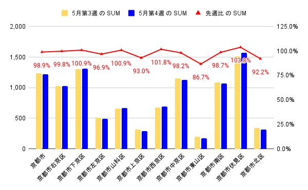 まずは京都市内から見ていきます。先週と比べて減少したエリアが多く、京都市東山区では先週比86.7%で26件の減少。その中で京都市伏見区では先週比58件の増加となりました。
