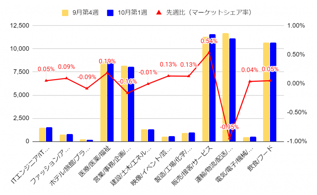 続いては業種別の掲載件数となります。件数では映像・イベント関連職が増加しています。マーケットシェアでは、販売・サービス関連職が増加する結果となりました。販売サービス業種に関しては、2週連続でシェアを伸ばしています。