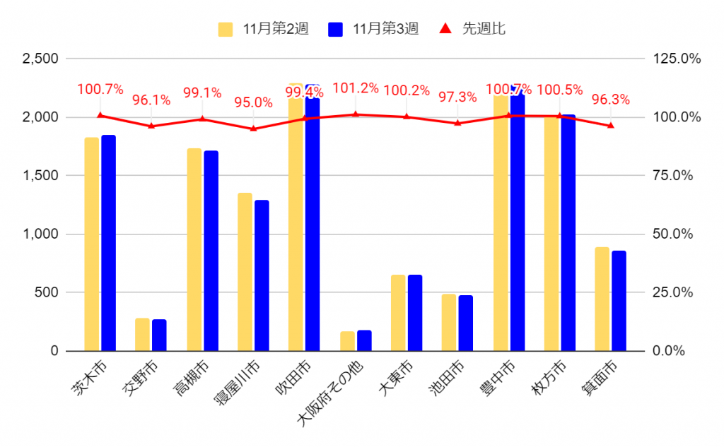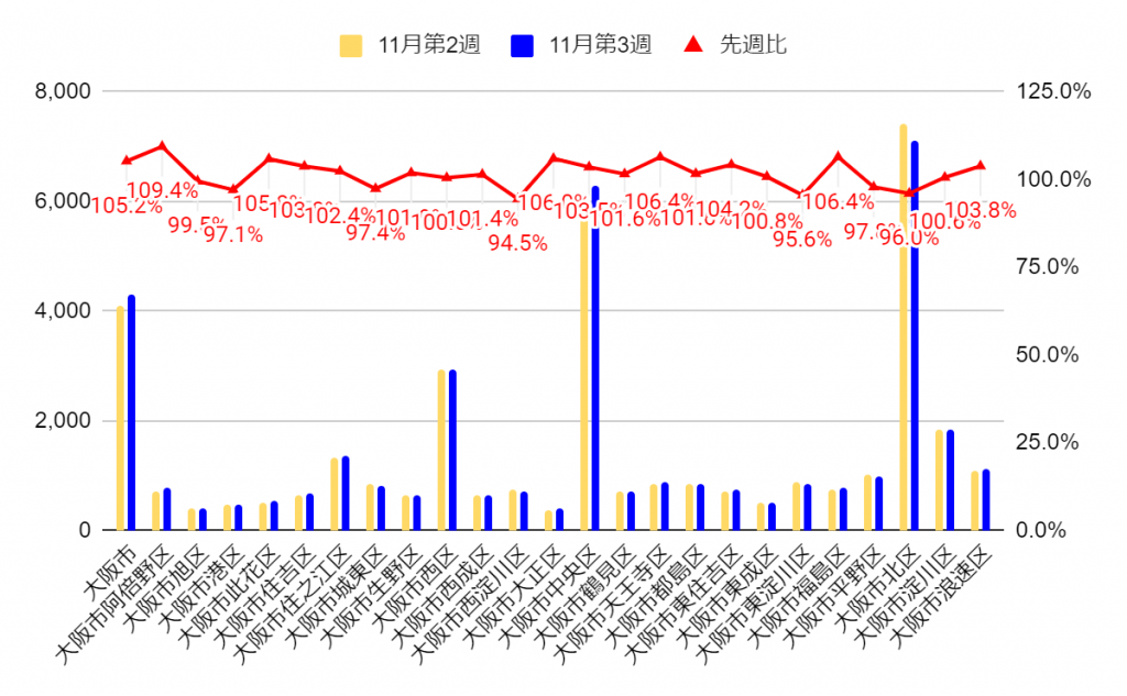まずは大阪市内から見ていきます。先週比で418件のプラスとなりました。5つの区では先週比で減少となりましたが、最大で5%程度にまでとどまっています。