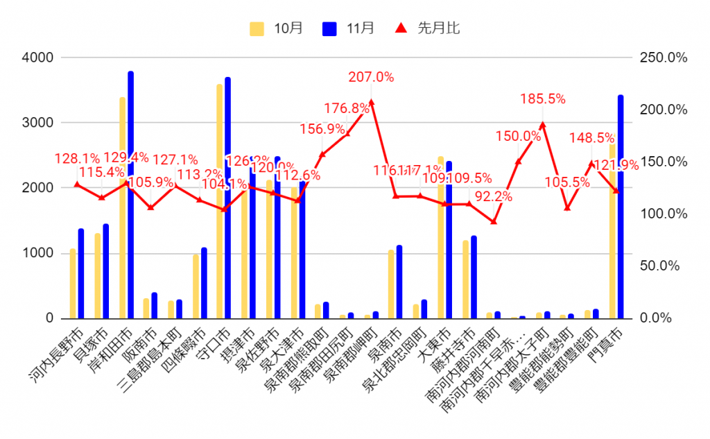 その他のエリアでは、先月比11,663件のプラスとなりました。こちらも南河内郡河南町を除き、すべてのエリアで増加となっています。特に下記のエリアでは増加幅が大きくなっています。