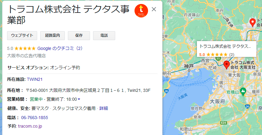 Googleマイビジネスでの発信も、比較的簡単に取り組めます。Googleマイビジネスとは、 Googleマップ上に載っている以下のような企業情報のことです。