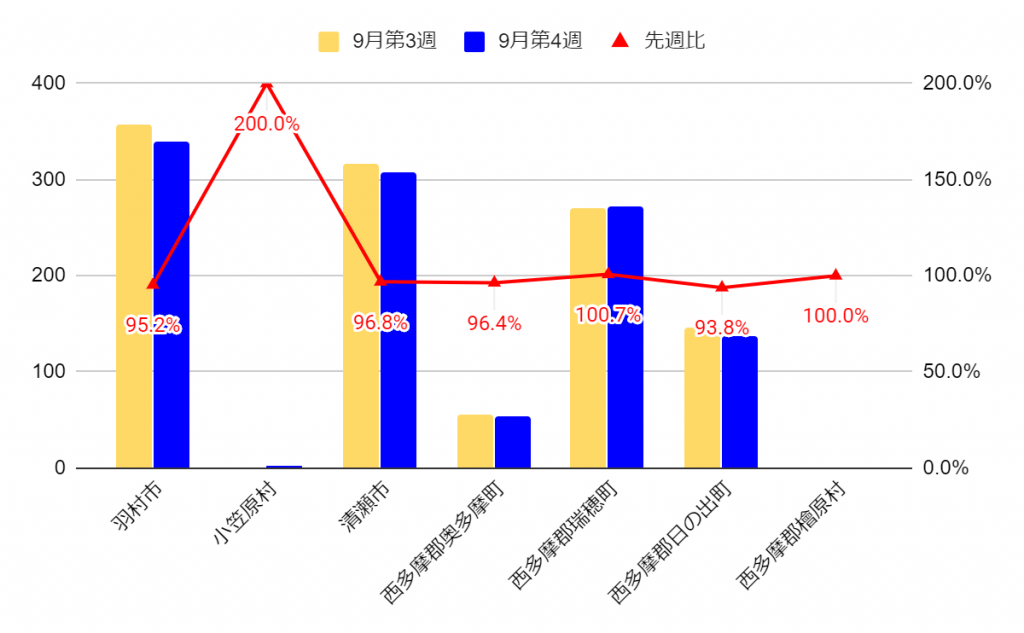 23区外では、先週比で1386件増加しています。市町村別に見ても、多くのエリアで増加に転じており、特に多摩市や稲城市などでは10%近くの増加となっています。