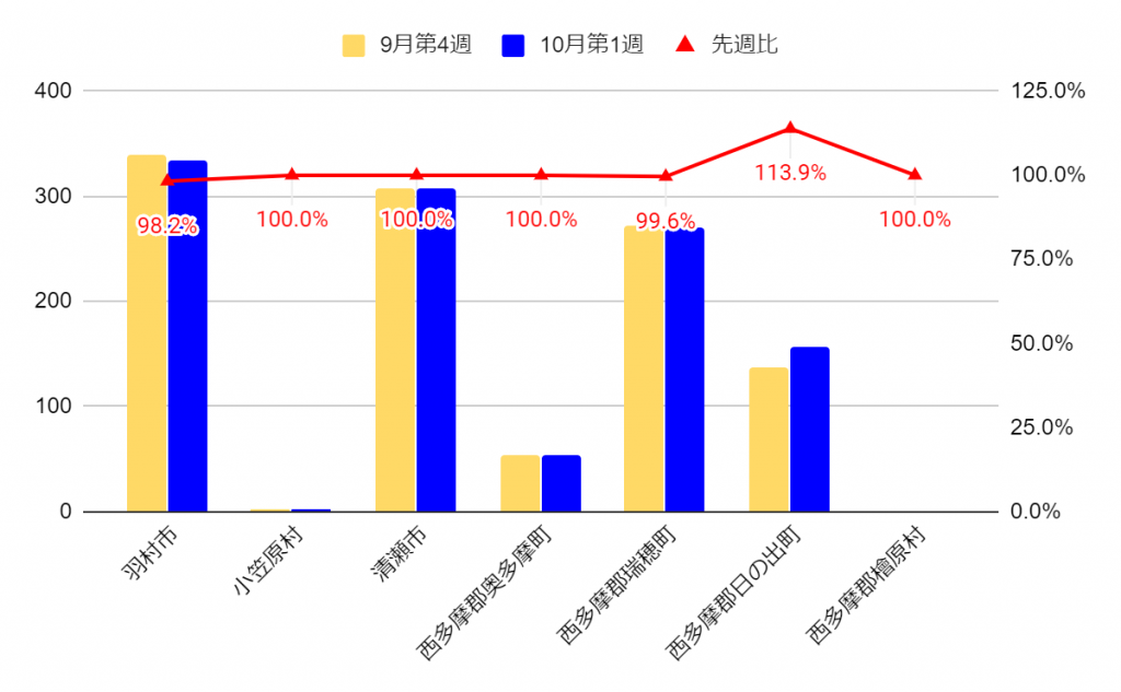 まずは23区内から見ていきます。先週比で833件減と、マイナスに転じています。2週連続での減少となりました。区ごとに見ても、おおむね減少となっていますが、荒川区や新宿区では微増となりました。