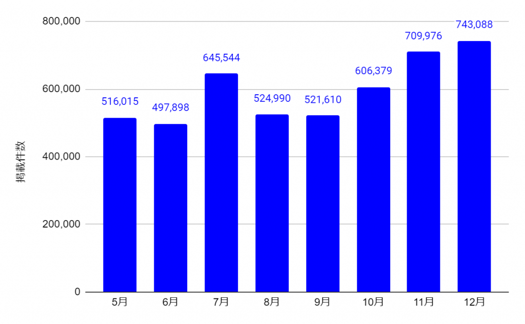 12月の求人数は11月から約3万件アップ。10月→11月間の9万件アップと比較をすると、やや求人数の伸長率は鈍化していますが、コロナ以降の最大求人数を更新しております。