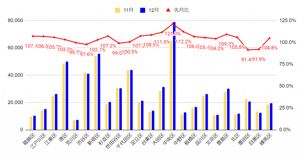 まずは23区内から見ていきます。先月比31,069件のプラスです。いくつかの区を除き、ほぼ全てのエリアで件数が増加しています。
