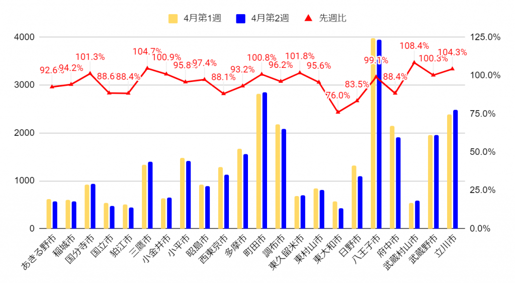 23区外では、先週比で1,341件のマイナスとなりました。下記のエリアでは変動が大きくなっています。