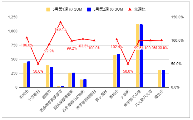 まずは23区内から見ていきます。渋谷区は先週比80.7%で、2448件ものマイナス。その他も減少しているエリアが多い結果となりました。
